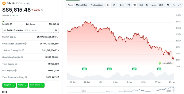 2025年11月21日,比特币跌破8.6万美元,以太坊跌破2800美元,加密总市值下探至3万亿美元,现报3.018万亿美元,24小时跌幅6.3%。