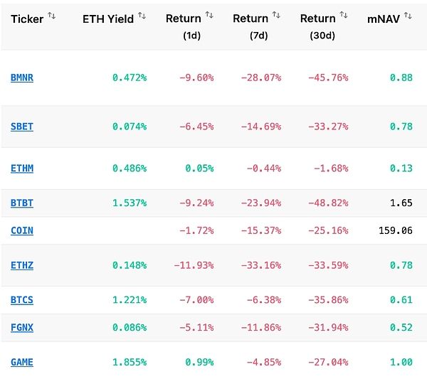 随着以太坊跌破3000美元,其他的ETH财库公司也陷入困局。据Capriole Investments 的数据显示,这些公司持有的 ETH 资产收益率为负 25% 至 48%。如下图所示,排名前十的 DAT 公司在周线和日线时间框架内均出现亏损。