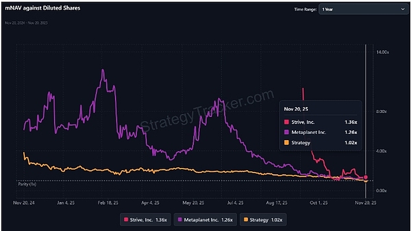 Capriole Investments 的数据还显示,这些公司中的大多数的市值与净资产值之比 (mNAV)(用于评估数字资产库估值的指标)已跌破 1,表明其融资能力受损。