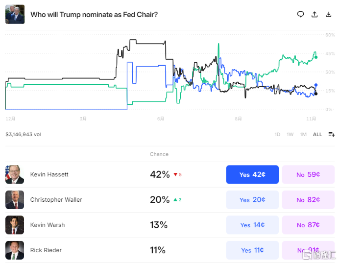 截至11月21日,预测平台Polymarket的数据显示,哈塞特被认为接任鲍威尔的概率最大,达42%。