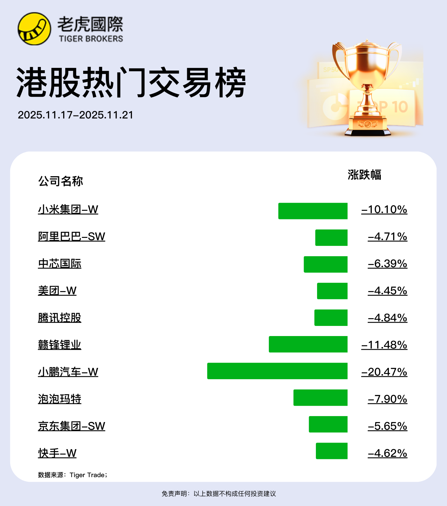 Top1:小米集团,本周二盘后,小米发布三季报,手机业务同比下滑3%;IoT业务增速大幅放缓;管理层称2026年小米汽车业务毛利率或下滑。受此影响,小米股价大跌,一度跌破37元,后在公司启动回购下,股价短线企稳;