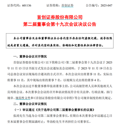 另外,首创证券董事会还选举刘惠斌为公司副董事长。上述相关任命已经董事会会议审议通过。