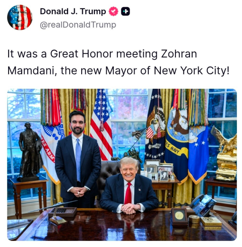 会面是曼达尼主动提出的。竞选期间,特朗普曾称他为“共产主义者”,并威胁要向纽约市派遣国民警卫队。然而,在这次会面中,特朗普却表现出极大热情,对这位新任市长当选人盛赞有加。