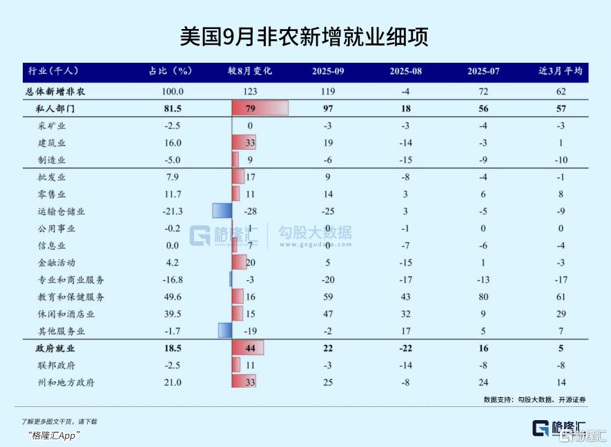 8月正值美国政府停摆,联邦统计机构员工休假导致数据搜集延迟,约1.2万家企业的用工数据未能纳入统计,这些数据在9月集中补报,直接推动9月机构调查新增岗位增加约3.8 万个。