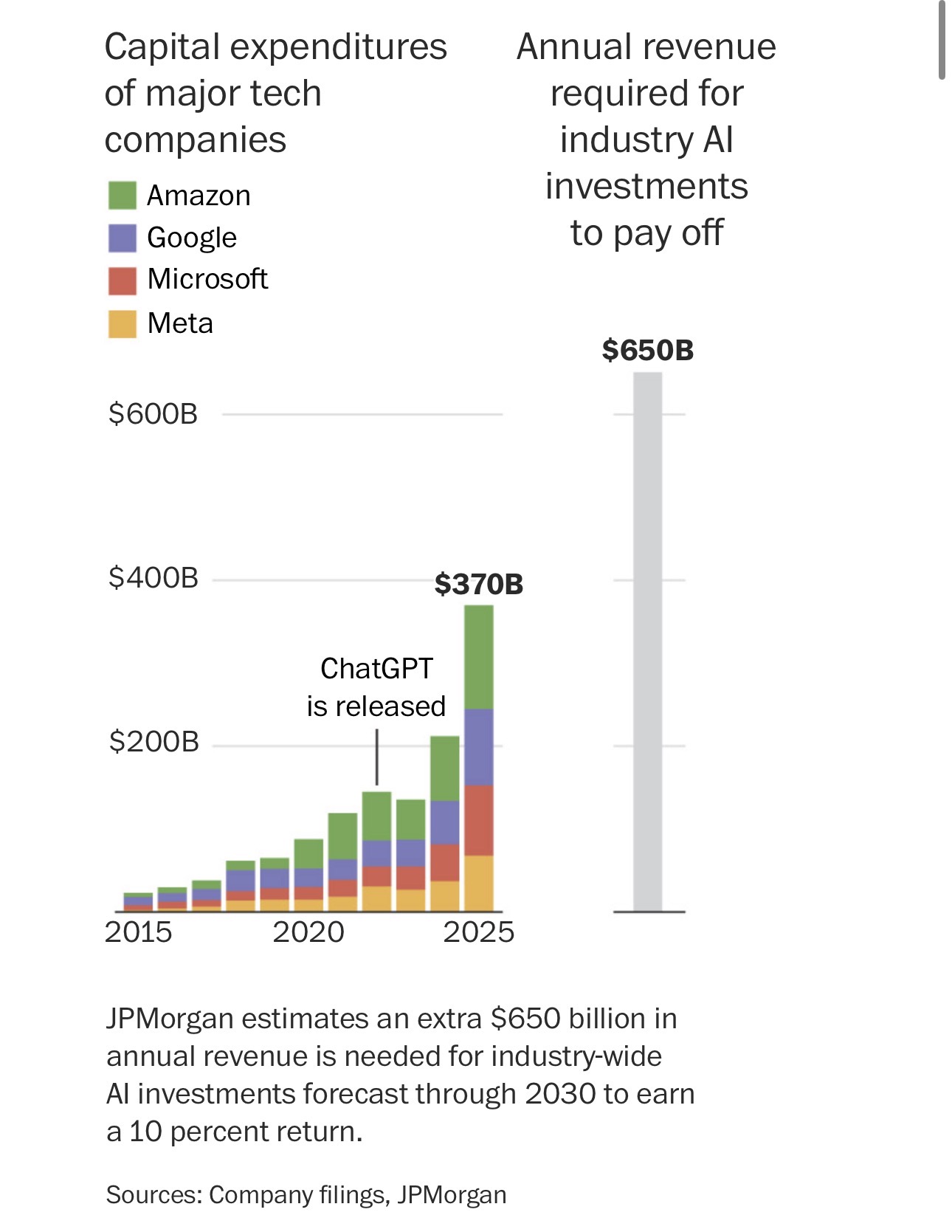 摩根大通最近计算,为了让预计到2030年的AI投资获得10%的回报,科技行业每年必须新增6千5百亿美元的营收。这个数字几乎是谷歌在2024年总营收的两倍。