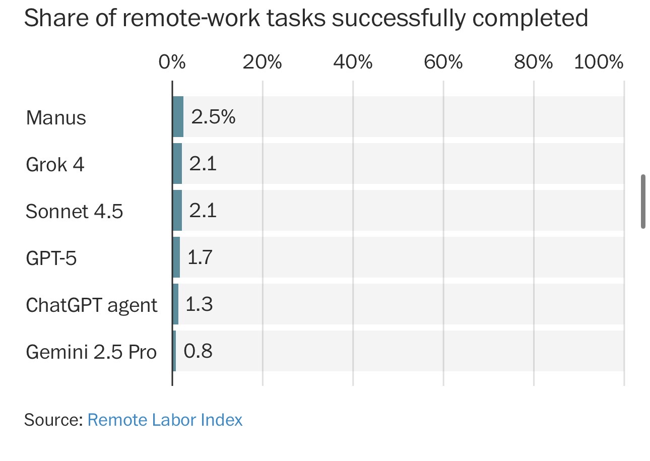 研究团队来自Scale AI和AI安全中心,这个非营利机构研究AI带来的风险。按照他们的数据,表现最好的AI系统只成功完成了2.5%任务。