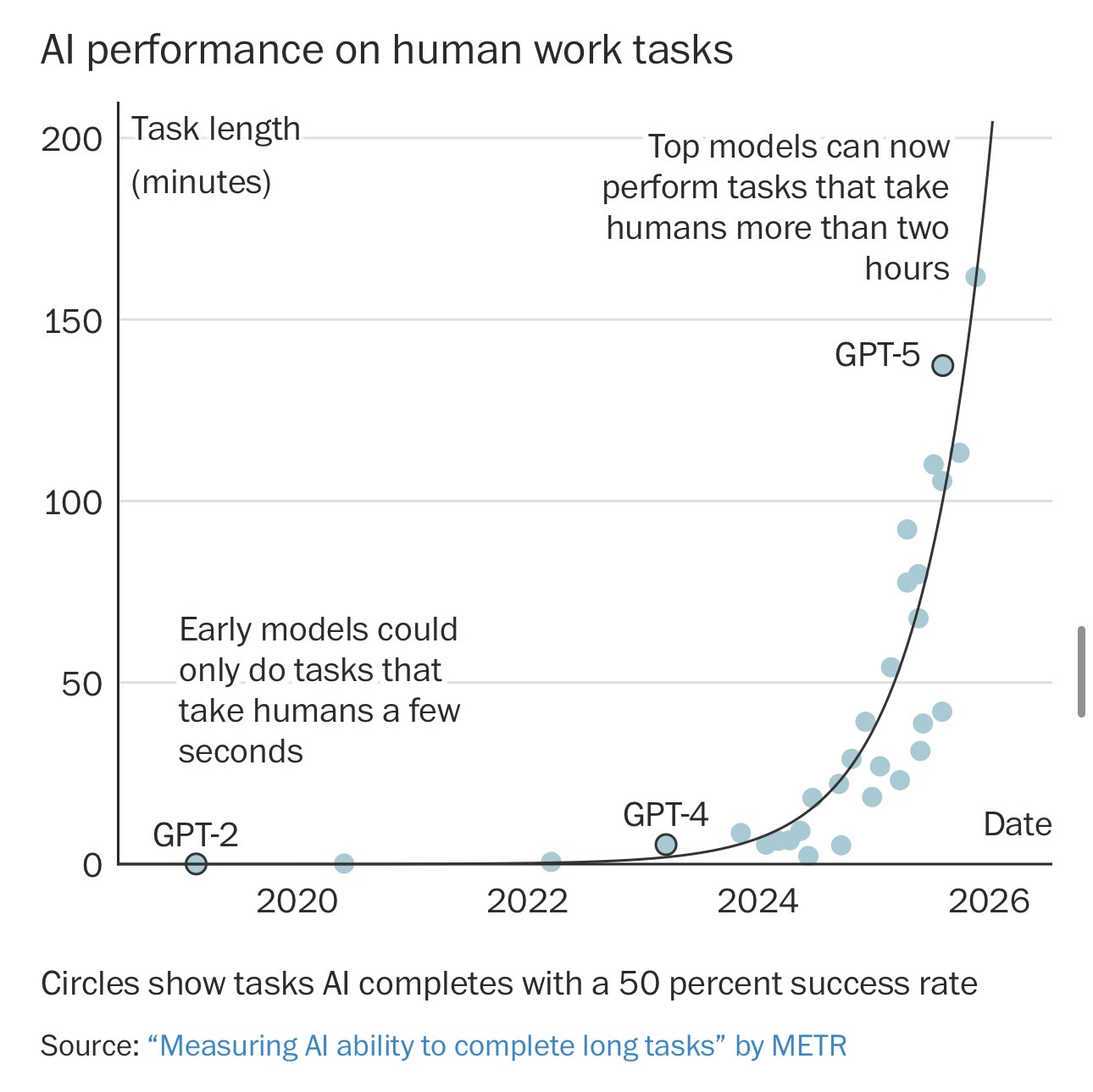 按照这种方式衡量,AI模型能够稳定完成的任务时长已经持续六年呈指数级增长,每七个月就翻一倍。