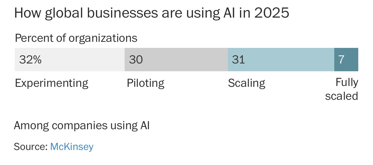 麦肯锡去年11月报告说,近三分之二已经采用AI的全球企业,还没有把这些工具在公司内部全面铺开。