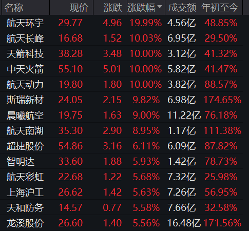 据交易所数据显示,截至11月24日10时44分盘中,商业航天板块表现活跃,板块内5只个股涨停。其中航天环宇20CM涨停,航天长峰、天箭科技、中天火箭、航天动力涨停。