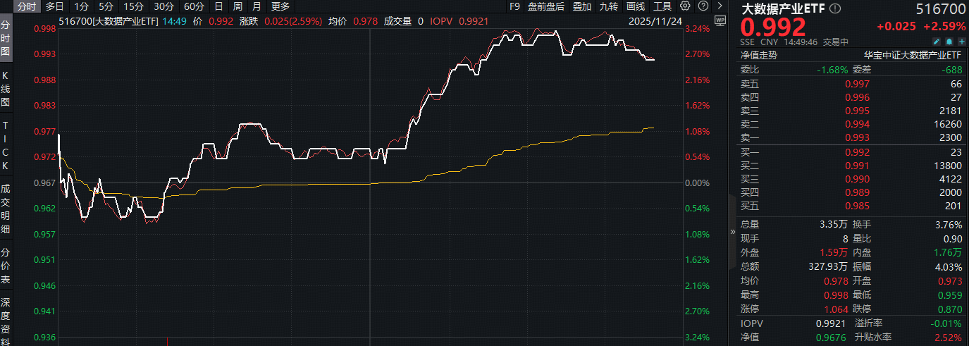 今日(11月24日)午后,阿里巴巴概念拉升,石基信息、数据港双双涨停,聚焦数据安全领域的大数据产业ETF(516700)场内价格盘中涨超3.2%,现涨2.59%。