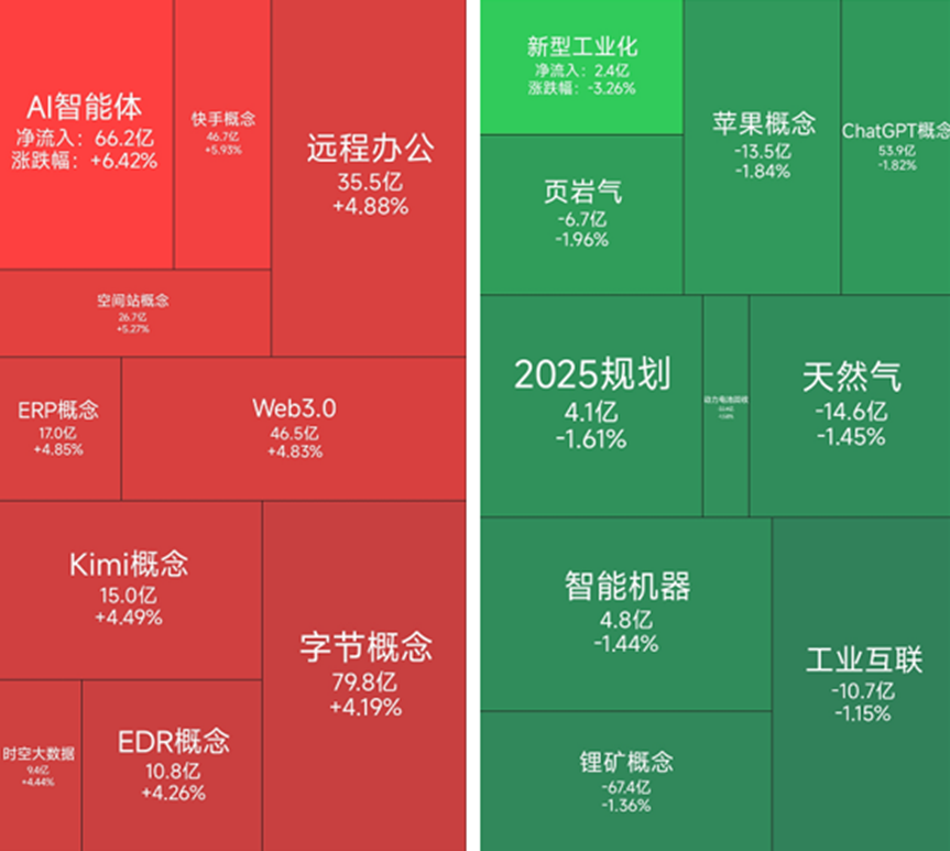 11月24日A股三大指数集体收涨,截至收盘,沪指涨0.05%报3836.77点,深成指涨0.37%报12585.08点,创业板指涨0.31%报2929.04点。从板块行情上来看,今日表现较好的是AI智能体、远程办公和Web3.0,而新型工业化、苹果概念和锂矿概念等板块下跌。