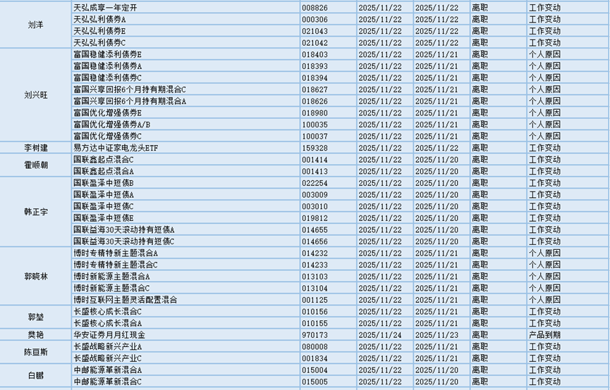 根据巨灵统计的数据显示,近30天(10.25-11.24)共有644只基金产品的基金经理发生离职变动。其中今天(11.24)有72只基金产品发布基金经理离职公告,从变动原因上来看,有15位基金经理是由于工作变动而从管理的40只基金产品中离职,有6位基金经理是由于产品到期而从管理的9只基金产品中离职。有3位基金经理是由于个人原因而从管理的23只基金产品中离职。