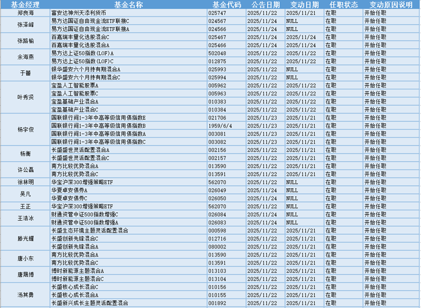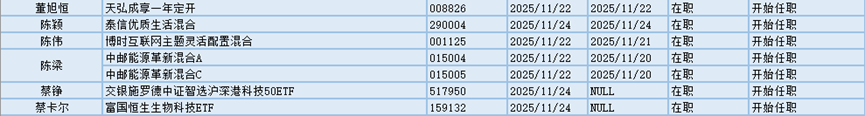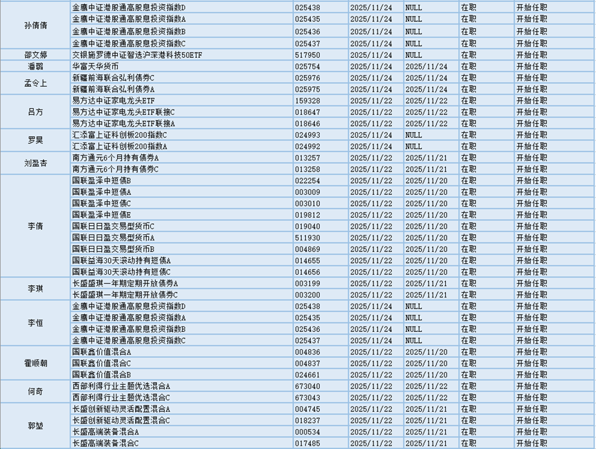 新基金经理上任方面,易方达基金余海燕现任基金资产总规模为4406.29亿元,管理过的基金都为指数型基金,任职期间回报最高的产品是易方达沪深300非银ETF(512070),为指数型基金,在任职的11年又154天时间内获得155.84% 的回报,至今仍在管理该基金。新上任易方达上证50指数(LOF)A、易方达上证50指数(LOF)C这两只基金产品的基金经理。