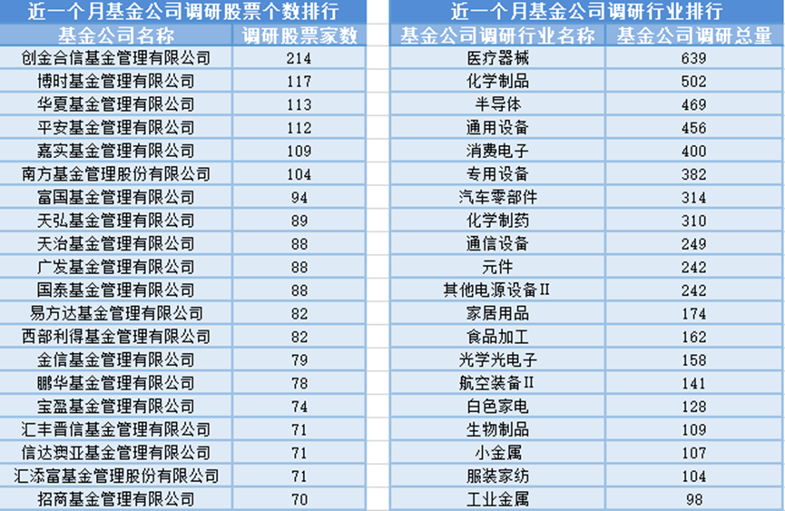 近一个月(10月25日-11月24日),创金合信基金参与公司调研的数量最多,共调研214家上市公司,然后调研较为活跃的还有博时基金、华夏基金和平安基金,分别调研117家、113家、112家上市公司;从调研行业上来看,基金公司对医疗器械行业的上市公司调研次数最多,共有639次,其次是化学制品行业,基金公司调研了502次。