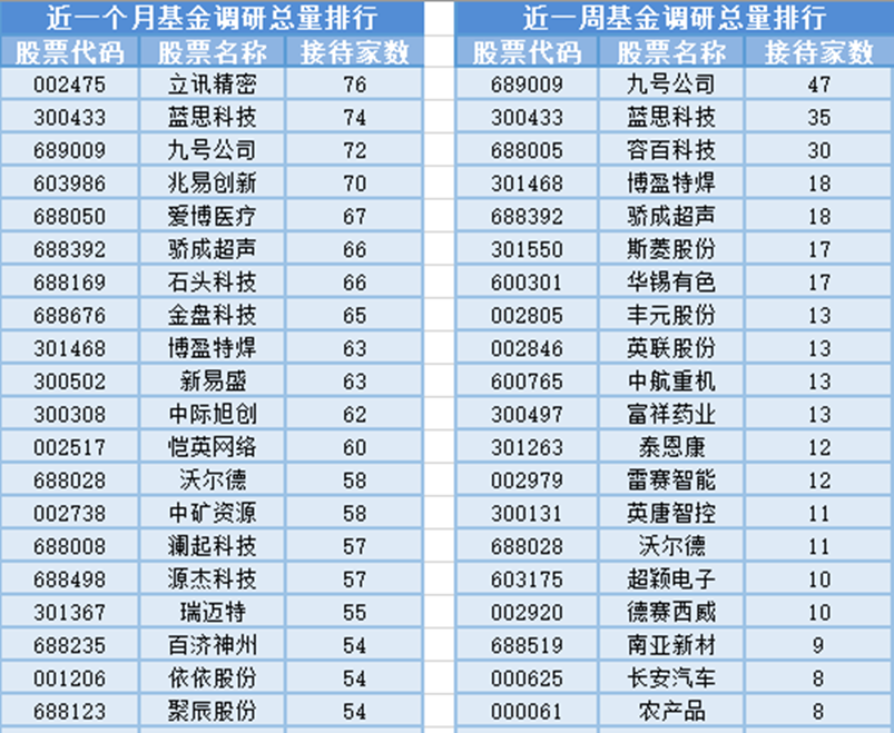 从个股调研情况上来看,最近1个月(10月25日-11月24日)最受公募基金关注的是立讯精密,属于消费电子行业,主营业务为从事消费电子、通信及数据中心、汽车、医疗等领域相关零组件、模组及系统集成业务。共有76家基金管理公司参与调研,其次是蓝思科技和九号公司,分别接受74家、72家基金管理公司的调研。