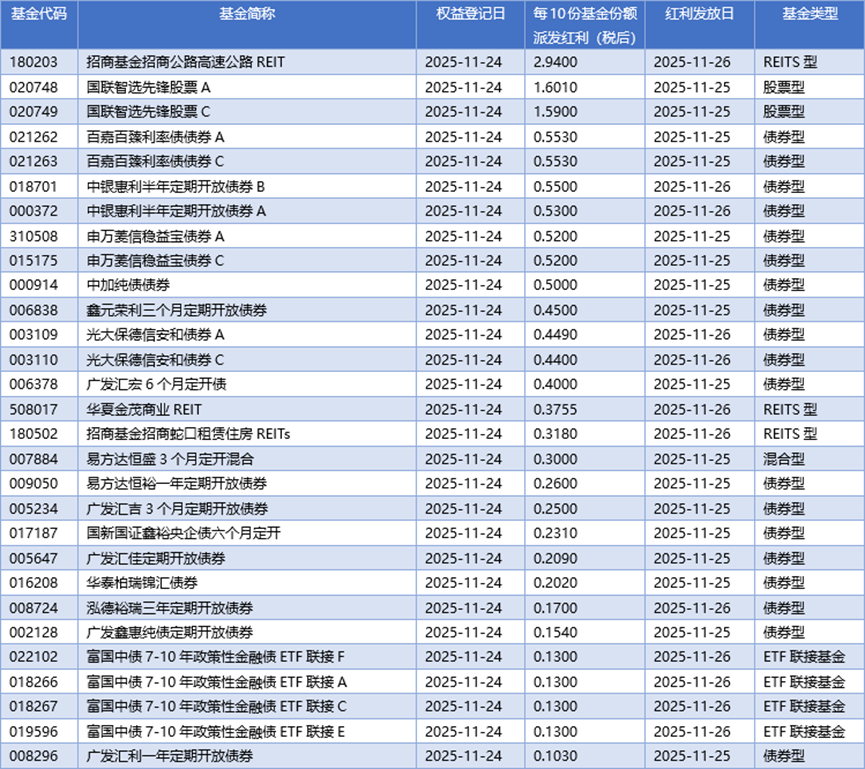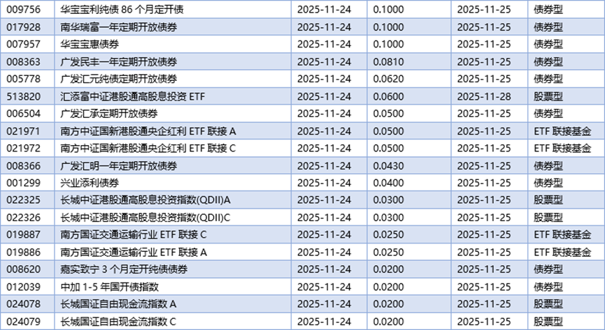 (1)11月24日新发基金共有29只,主要为股票型基金和债券型基金,其中广发中证全指食品ETF募集目标金额达80.00亿元;基金分红48只,多为债券型,派发红利最多的基金是招商基金招商公路高速公路封闭式基础设施证券投资基金,每10份基金份额派发红利2.9400元。