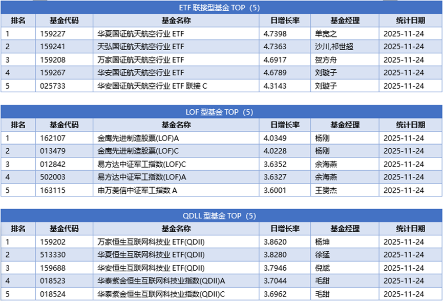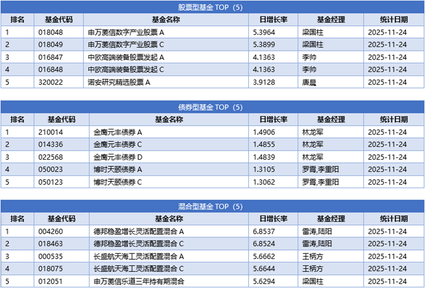 单基金方面,剔除掉 创新封基类型 基金的影响,11月24日业绩表现最好的基金为德邦稳盈增长灵活配置混合A,日增长率为6.8537%,其次为德邦稳盈增长灵活配置混合C,日增长率为6.8524%、长盛航天海工灵活配置混合A,日增长率为5.6662%。