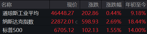 当地时间11月24日,美股市场迎来全面反弹,三大指数集体上扬,为投资者带来了一波乐观情绪。道琼斯指数上涨0.44%,报46448.27点;标准普尔500指数上涨1.55%,报6705.12点;纳斯达克综合指数更是以2.69%的涨幅领跑,报22872.01点,创下5月以来的最大单日涨幅。