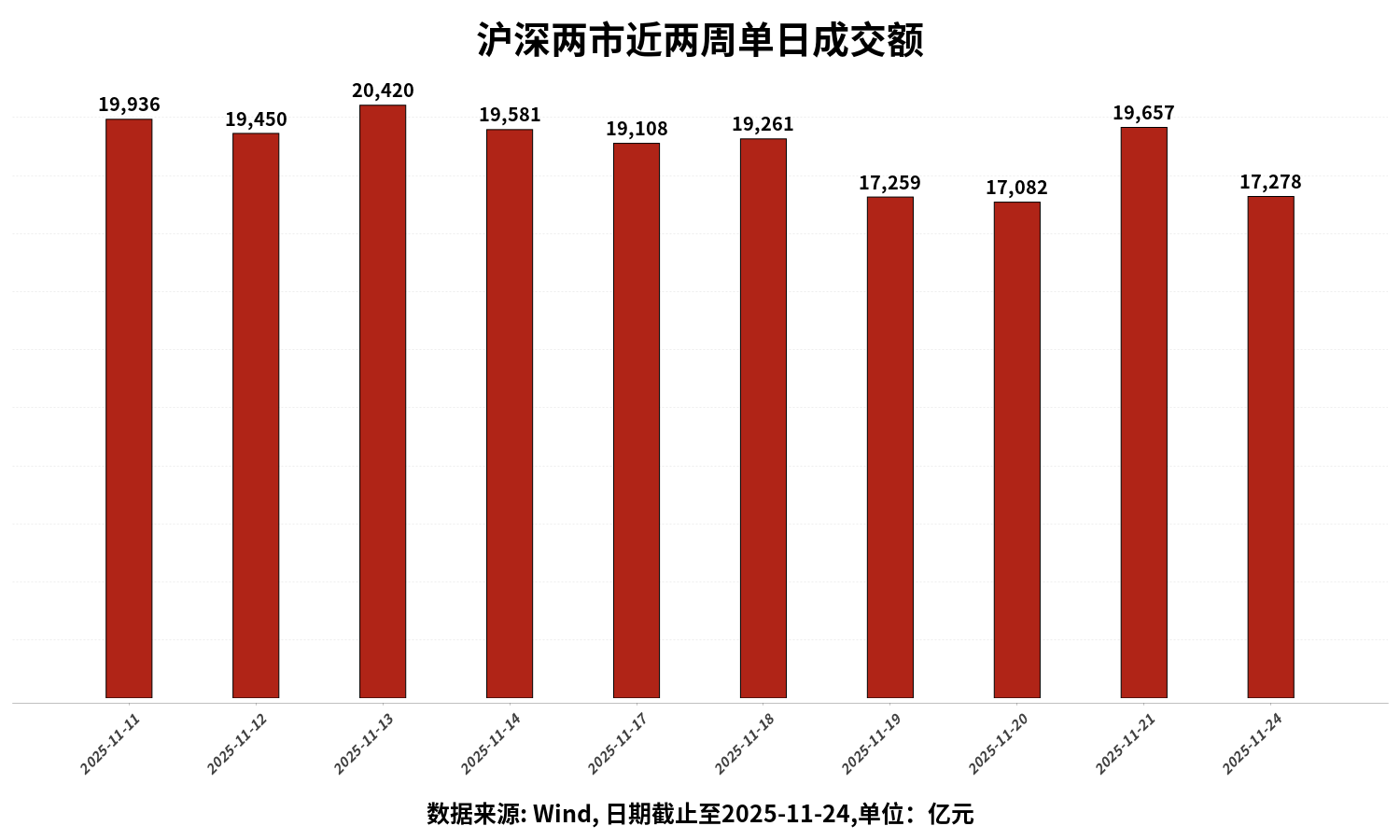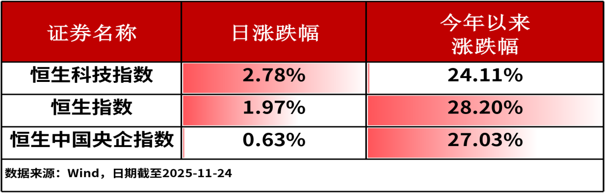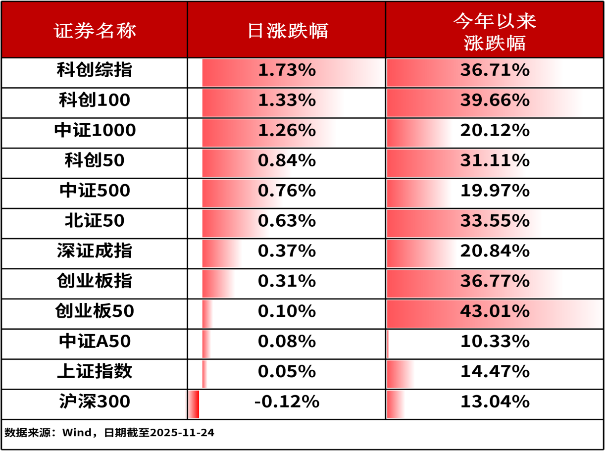 11月24日,A股三大股指表现分化,上证指数微涨0.05%,深证成指上涨0.38%,创业板指上涨0.31%。主流宽基指数中,科创综指上涨1.73%,涨幅相对居前。全市场共4,224只股票上涨。港股三大股指集体收涨,其中恒生科技指数上涨2.78%,涨幅居前。A股市场今日成交额为17278亿元人民币,较上一交易日大幅缩量,缩量达2379亿元。