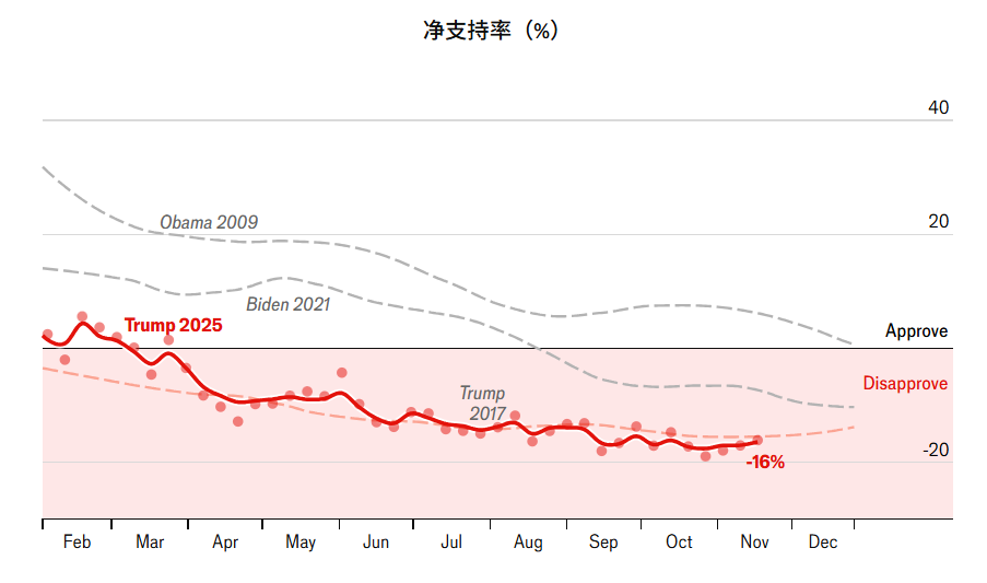最近几项民调显示,他的支持率略有上升,可能是因为政府停摆结束的影响。但这些调查都在他对爱泼斯坦案件档案问题突然转变态度之前。