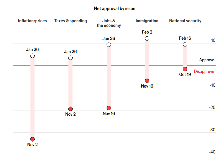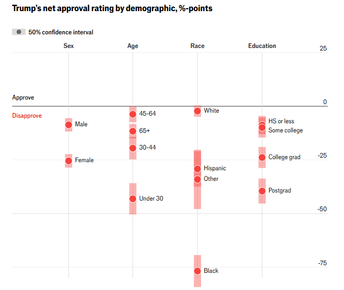 他重返白宫时,这一群体对他的净支持率为正3,现在则为负41。拉美裔和非洲裔美国人对他的评价本就为负,如今也大幅下滑。就连白人选民也出现转变,从一月份的净支持率正16,变成如今略为负面。