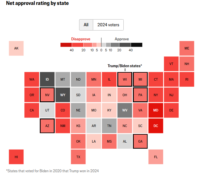 如预期那样,在倾向于支持民主党的州中,他的支持率最低;而在倾向支持共和党的州中,他的支持率最高。特朗普的选民依然大多支持他的表现。但也揭示即便是在几个月前还投票支持他的州中,对他的不满情绪也已相当普遍。