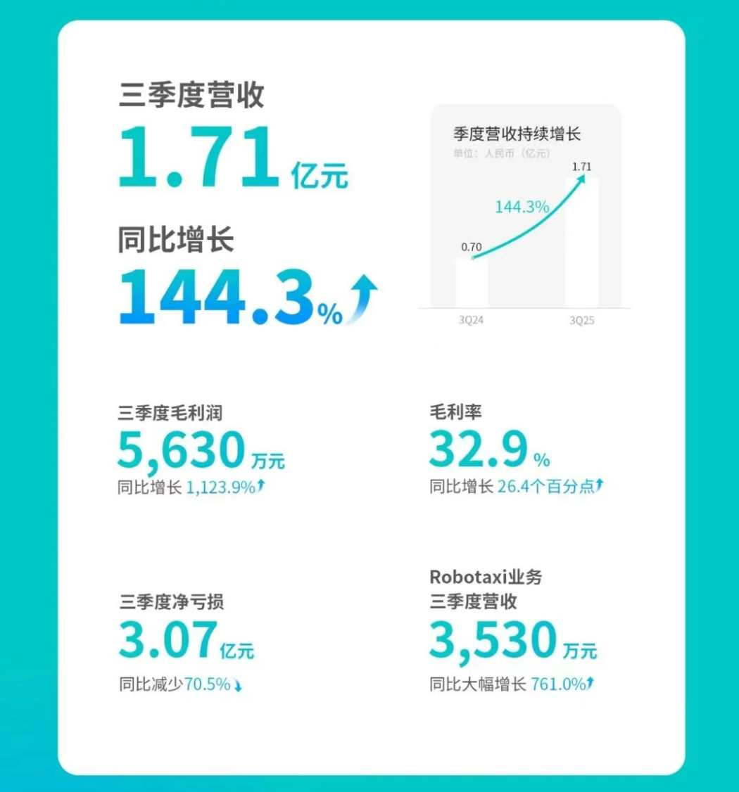 短短三周后,11月24日,文远知行正式公布2025年第三季度财报。财报显示,公司商业化征程继续强劲提速。