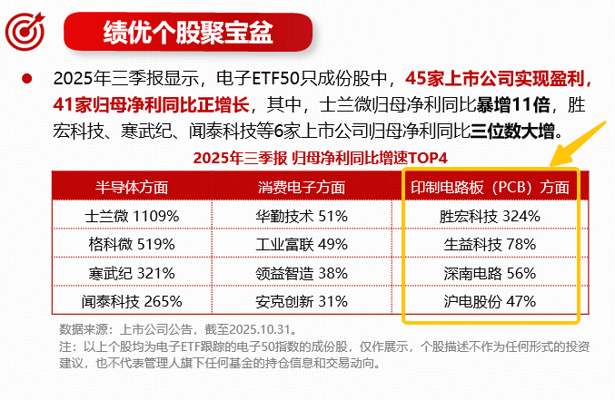 风险提示:电子ETF及其联接基金被动跟踪中证电子50指数,该指数基日为2008.12.31,发布于2009.7.22,指数成份股构成根据该指数编制规则适时调整,其回测历史业绩不预示指数未来表现。本文中提及的个股、指数成份股仅作展示,个股描述不作为任何形式的投资建议,也不代表管理人旗下任何基金的持仓信息和交易动向。基金管理人评估电子ETF的风险等级为R3-中风险,适宜平衡型(C3)及以上的投资者,适当性匹配意见请以销售机构为准。任何在本文出现的信息(包括但不限于个股、评论、预测、图表、指标、理论、任何形式的表述等)均只作为参考,投资人须对任何自主决定的投资行为负责。另,本文中的任何观点、分析及预测不构成对阅读者任何形式的投资建议,亦不对因使用本文内容所引发的直接或间接损失负任何责任。基金投资有风险,基金的过往业绩并不代表其未来表现,基金管理人管理的其他基金的业绩并不构成基金业绩表现的保证,基金投资须谨慎。