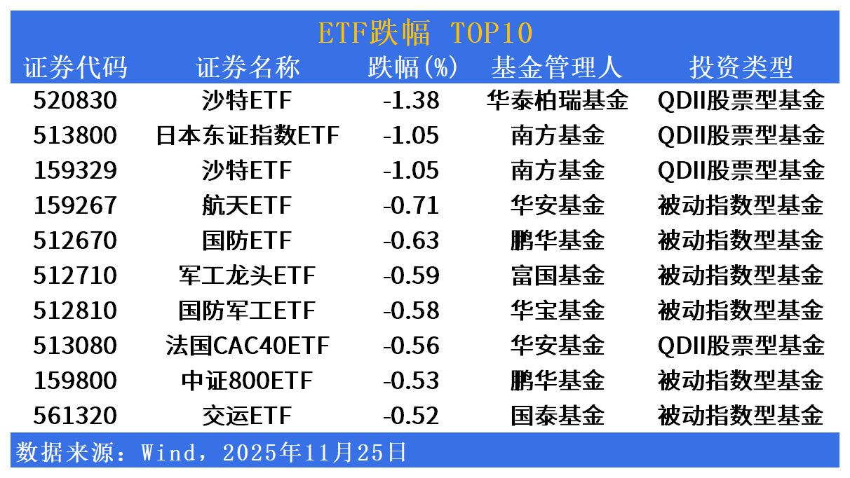 跌幅方面,沙特、军工相关ETF延续回调