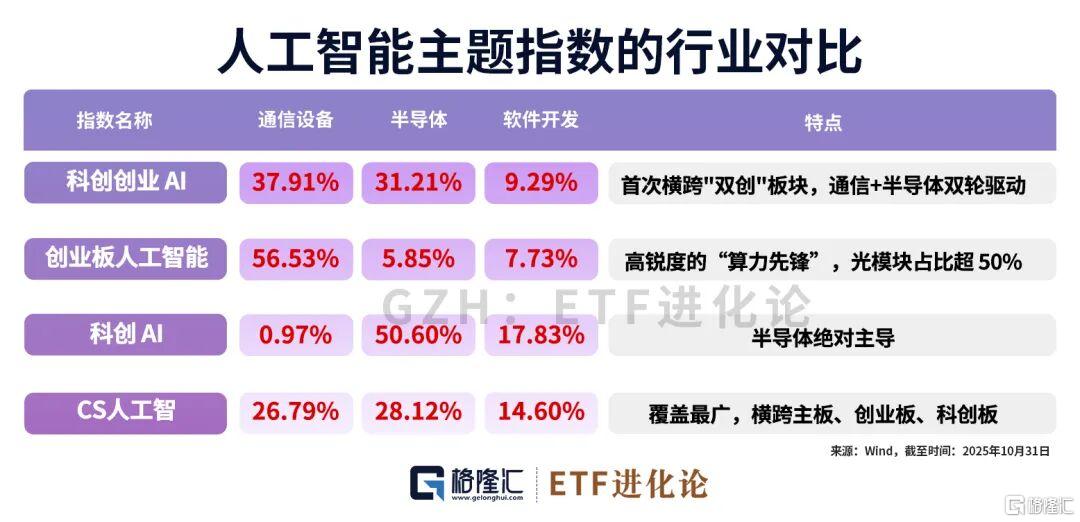 相较科创AI、创业板人工智能等单一市场的AI主题指数,科创创业AI在实现AI全产业链覆盖同时,对关键领域进行了进一步的提纯,明确聚焦通信设备 半导体。