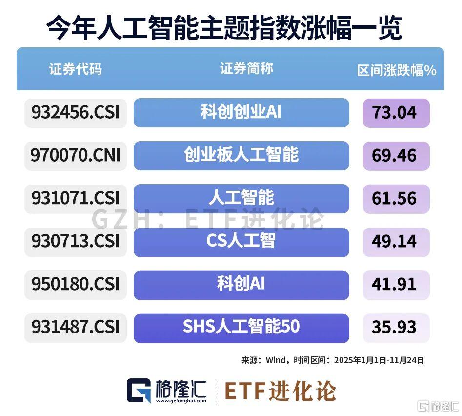 集双创锐度于一身的科创创业AI指数,业绩表现同样锋利十足,截至11月24日,该指数年内上涨73%,一举打败创业板人工智能(69.36%),跻身新任最牛AI指数,同样优于CS人工智(49.14%)科创AI(41.91%)等人工智能主题指数。