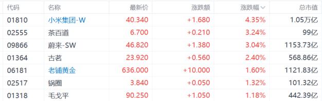 新消费概念股上涨,茶百道、蔚来涨超3%,古茗涨超2%,老铺黄金、锅圈、毛戈平纷纷收涨。