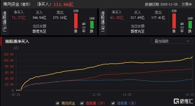 今日,南向资金净买入111.66亿港元,其中港股通(沪)净买入71,1.35亿港元,港股通(深)净买入40.28亿港元。