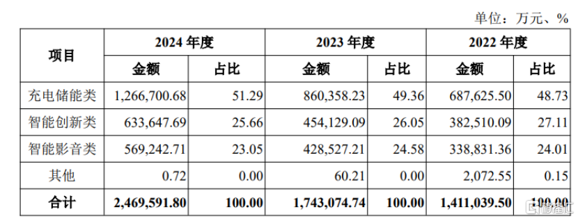 根据安克创新2025年6月公告的《向不特定对象发行可转换公司债券募集说明书》(简称:可转债募集说明书),公司的主营业务收入中,充电储能类占比最高,2024年为51.29%,智能创新类占比为25.66%,智能影音类占比为23.05%。