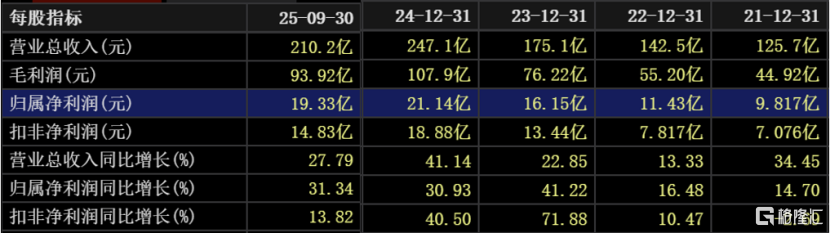 2022年、2023年、2024年及2025年1-9月,公司的收入分别为142.5亿元、175.1亿元、247.1亿元、210.2亿元,分别录得归属净利润11.43亿元、16.15亿元、21.14亿元、19.33亿元。