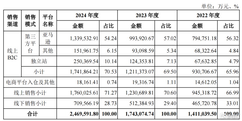 其中,线上B2C平台是公司主要的产品销售渠道。2022年至2024年,公司线上B2C模式销售收入占主营业务收入比重分别为65.96%、69.50%和70.53%。线上销售收入中,亚马逊渠道占比75%以上。