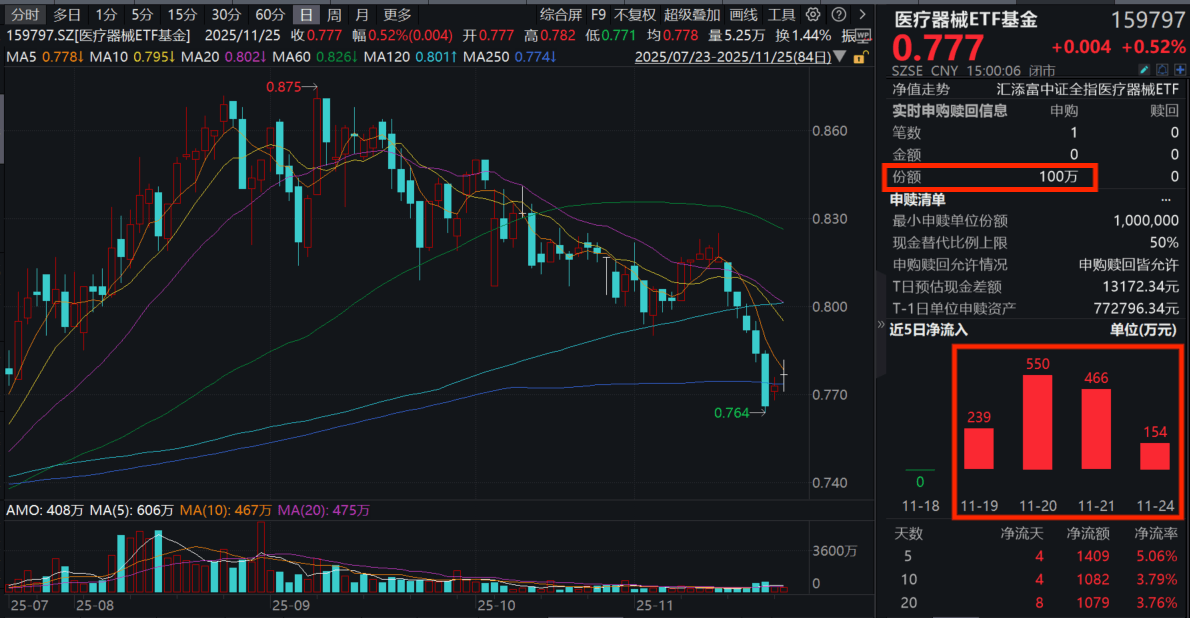 医疗器械已跌出“黄金坑”?板块迎重磅利好,医疗器械ETF基金(159797)再度飘红收涨近1%连续5日吸金!机构:关注医疗器械的出海趋势!
