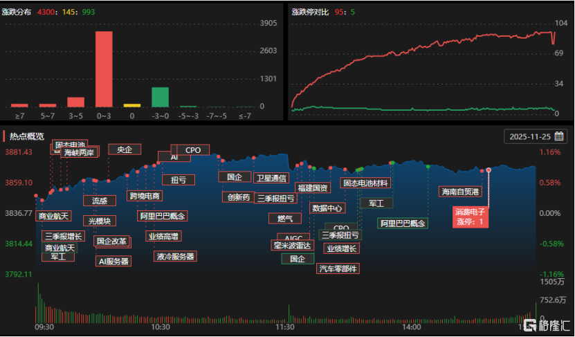 11月25日,沪指涨0.87%,深成指涨1.53%,创业板指涨1.77%。全市场成交额1.83万亿元,4300只个股上涨,95只个股涨停。游戏、AI应用、CPO、贵金属等板块涨幅居前,军工装备、养殖板块下跌。