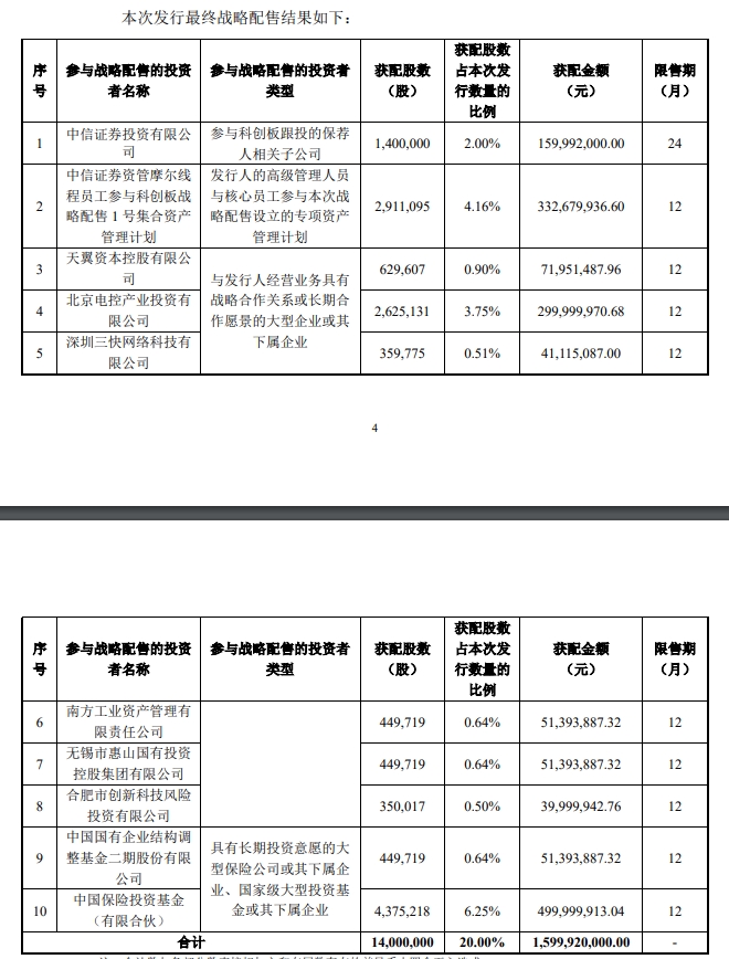在今晚的公告中,此次机构战略配售具体结果同步出炉,中国电信旗下‌天翼资本、北京电控产业投资有限公司、兵装系南方工业资产管理有限责任公司、无锡市惠山国有投资控股集团有限公司、合肥市创新科技风险投资有限公司、中国国有企业结构调整基金二期股份有限公司、中国保险投资基金等7家央国企背景企业也都拿到了宝贵的份额,此外,美团系深圳三快网络科技有限公司跻身其中。