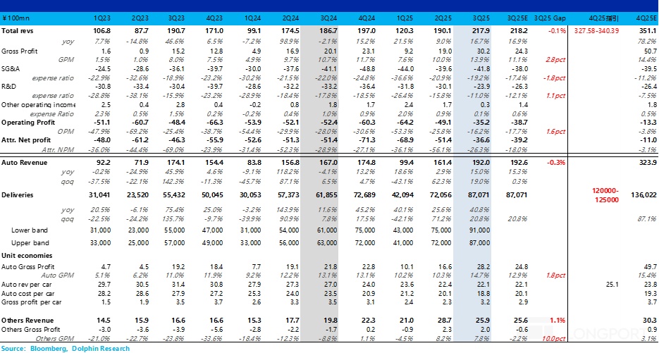 2. 整体收入端基本和市场预期持平:三季度整体收入 218 亿,基本和市场预期持平,而最核心的卖车收入 192 亿,环比提升 19%,主要由于蔚来三季度 L90 的爆销。但卖车单价环比略有下行了 0.3 万元至 22.1 万元,主要由于本季度有 “免费升级电池 “带来的变相降价,以及车型结构中价位相对更低的乐道 L90 占比的提升,车型结构有所下沉所致。