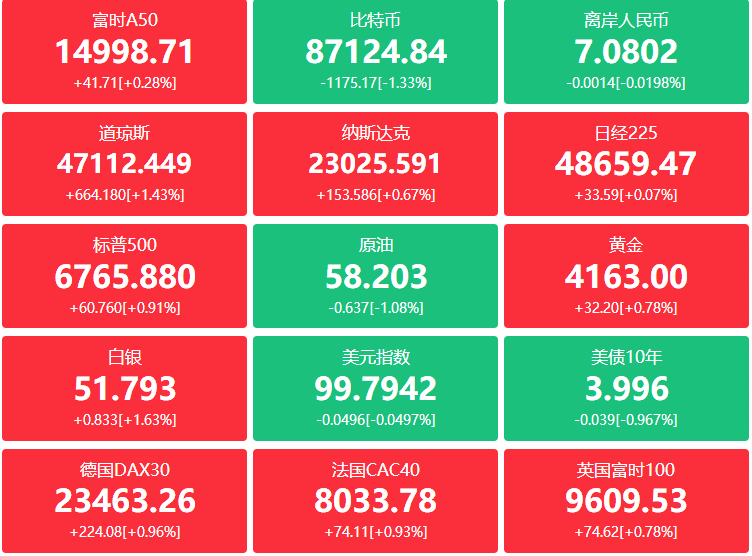 外盘:劳动力市场疲软提振12月降息概率,美股全线收涨,道指涨664.18点,涨幅1.43%报47112.45点;纳指涨153.59点,涨幅0.67%报23025.59点;标普500涨60.76点,涨幅0.91%报6765.88点;大型科技股走势分化,Meta涨超3%,谷歌、亚马逊涨超1%;AMD跌超4%,英伟达、奈飞跌超2%,甲骨文跌超1%;中概股涨跌互现,纳斯达克中国金龙指数收涨0.35%。小鹏汽车、哔哩哔哩涨超3%,理想汽车涨超1%,蔚来跌超4%,阿里巴巴跌超2%,百度跌超1%。