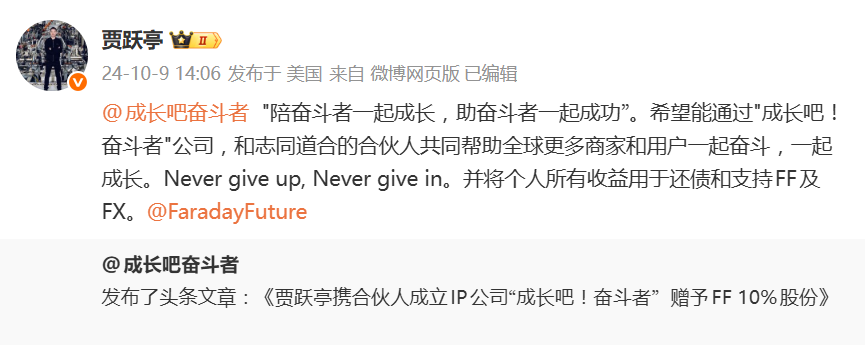 2024年10月9日,贾跃亭在微博宣布,其与合伙人共同成立的全球IP商业化公司——“成长吧!奋斗者”(Grow Fandor)已在美国和中国注册成立。