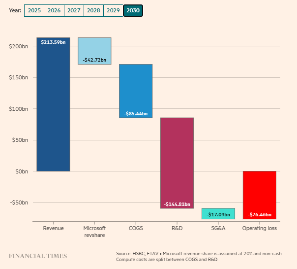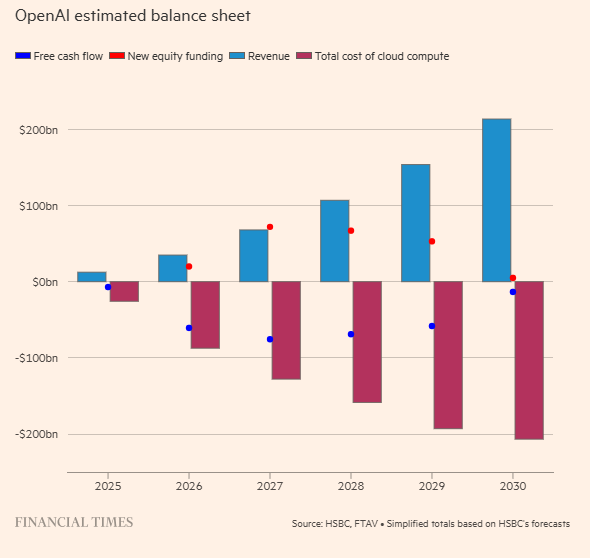 汇丰估算,为了维持亏损运营至2030年,OpenAI至少需要再融资2070亿美元