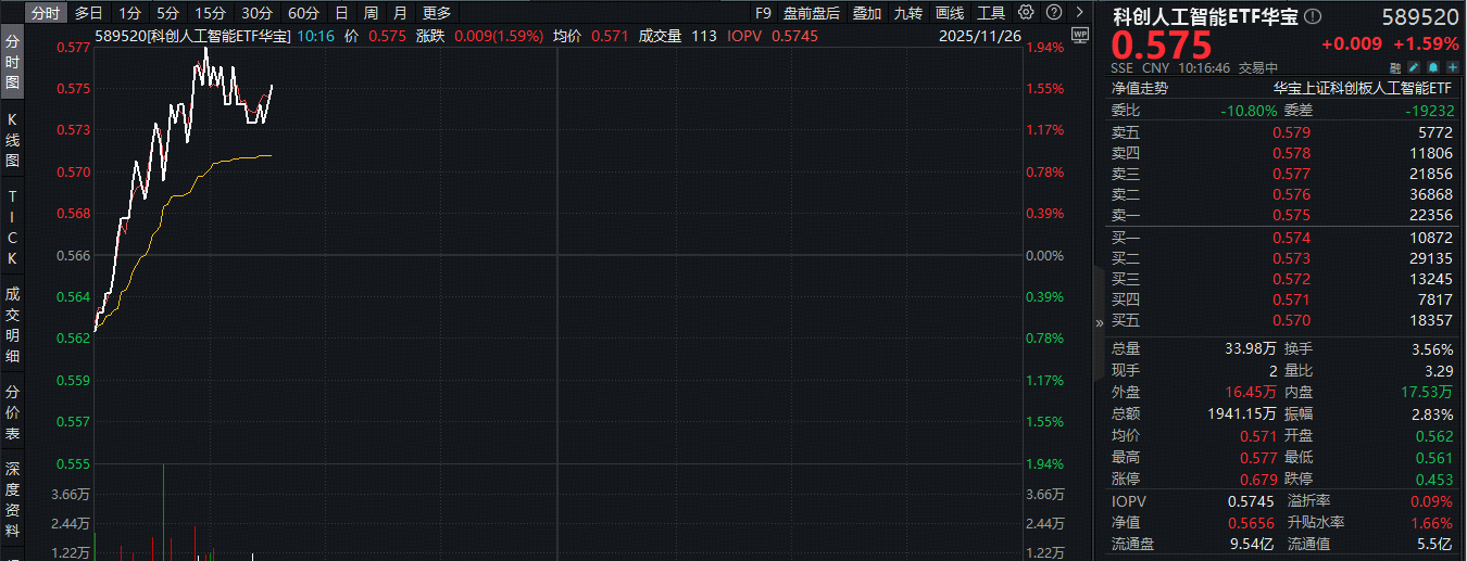 或由于AI爆款迭现,今日(11月26日)AI概念股连续第3日表现强势,重点布局国产AI产业链的科创人工智能ETF(589520)场内涨幅盘中上探1.94%,现涨1.59%,冲击日线3连阳!