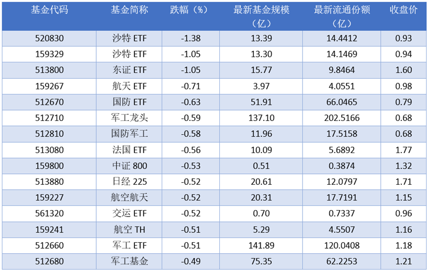 下跌方面,2025年11月25日跌幅最大的是沙特ETF(520830),跌幅达到1.38%。排名靠前的沙特ETF(159329)、东证ETF (513800)、航天ETF(159267),跌幅分别为1.05%、1.05%、0.71%。