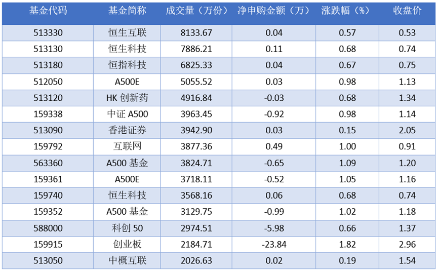 从成交量上来看,2025年11月25日成交量最大的是恒生互联(513330),成交量为8133.67万份。排名靠前的恒生科技(513130)、恒指科技(513180)、A500ETF(512050),成交量分别为7886.21万份、6825.33万份、5055.52万份。