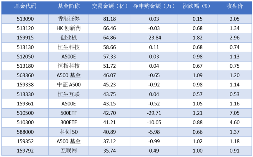 从成交金额上来看,2025年11月25日成交额最大的是香港证券(513090),交易金额81.18亿元。排名靠前的HK创新药(513120)、创业板(159915)、恒生科技(513130),成交额分别为66.46亿元、64.86亿元、58.66亿元。