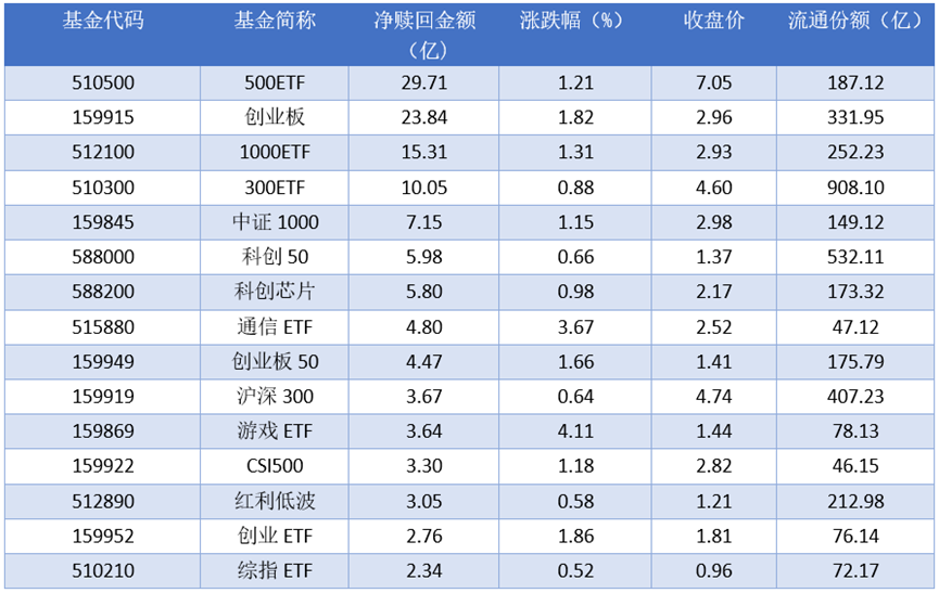 资金流出方面,2025年11月25日净赎回金额最多的是500ETF(510500),赎回金额29.71亿元。排名靠前的创业板(159915)、1000ETF (512100)、300ETF (510300),赎回金额分别为23.84亿元、15.31亿元、10.05亿元。