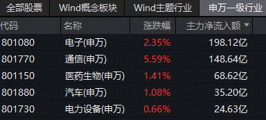 资金面上,主力资金大举涌入双创方向!截至发稿,电子、通信、医药生物、电力设备板块分别获主力资金净流入198亿元、148亿元、68亿元、24亿元,跻身31个申万一级行业TOP5