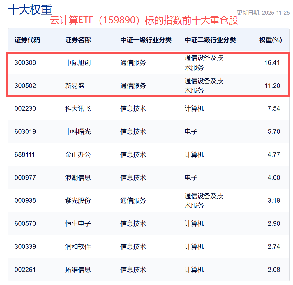 云计算ETF(159890)跟踪云计算指数,前十大成份股覆盖中际旭创、新易盛两大光模块龙头;中科曙光、浪潮信息等电子终端及组件龙头,还有科大讯飞、金山办公等软件开发龙头,兼具AI基建 AI应用属性,或为AI大时代一站式解决方案。